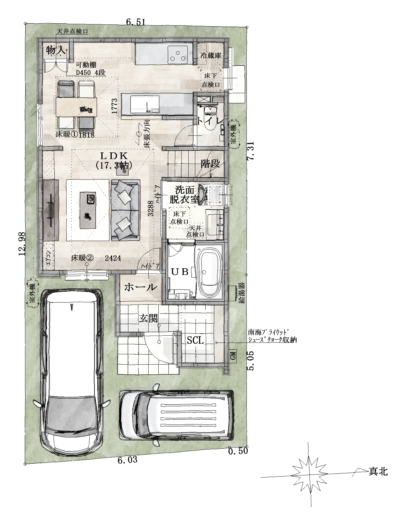 - 効率的な動線が特徴のII型セパレートキッチンを採用