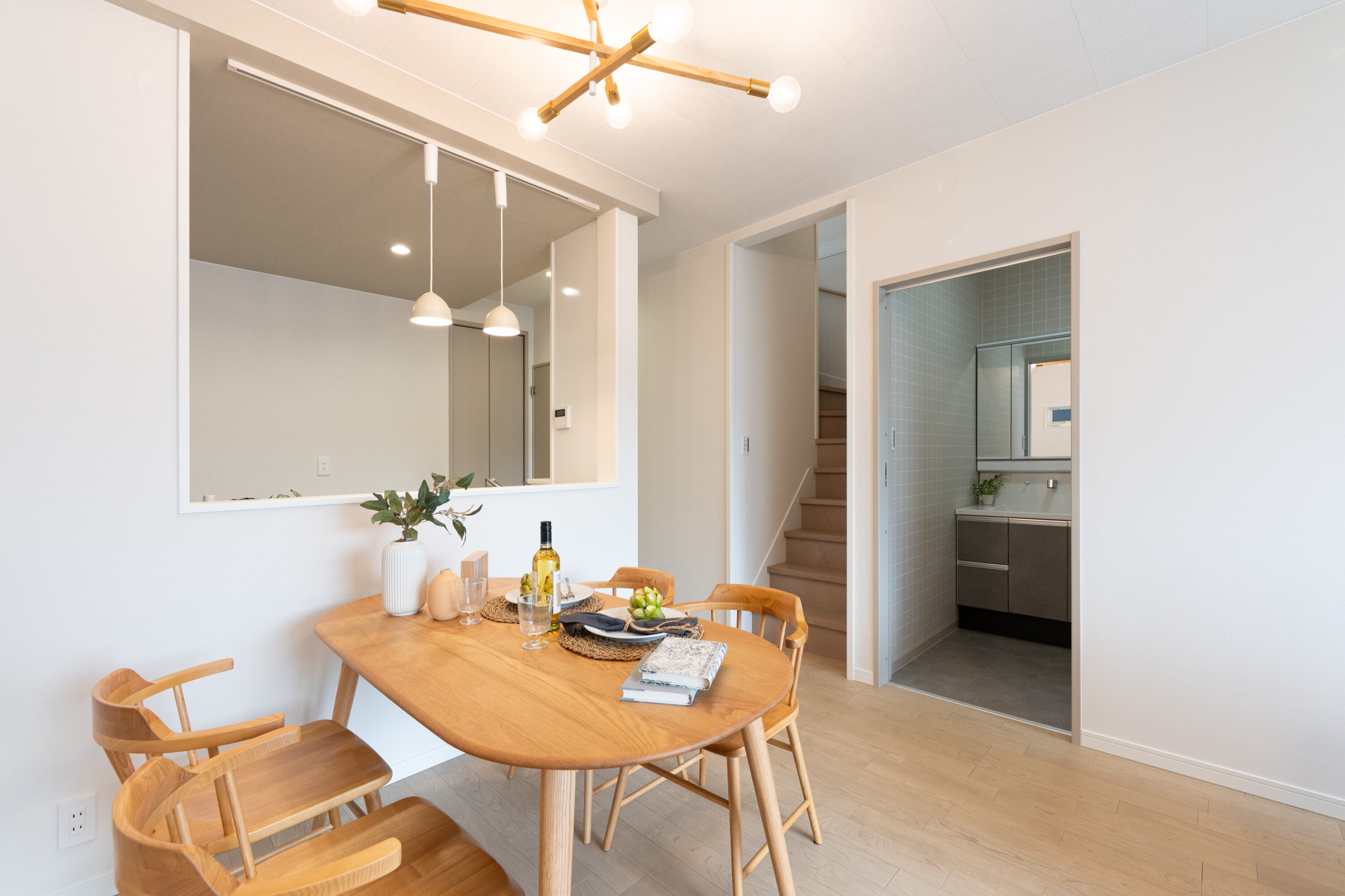 ご家族とのコミュニケーションを取りやすい対面式キッチンを採用。キッチン前面には腰壁を設けているため、調理中の手元を隠すことができます。
