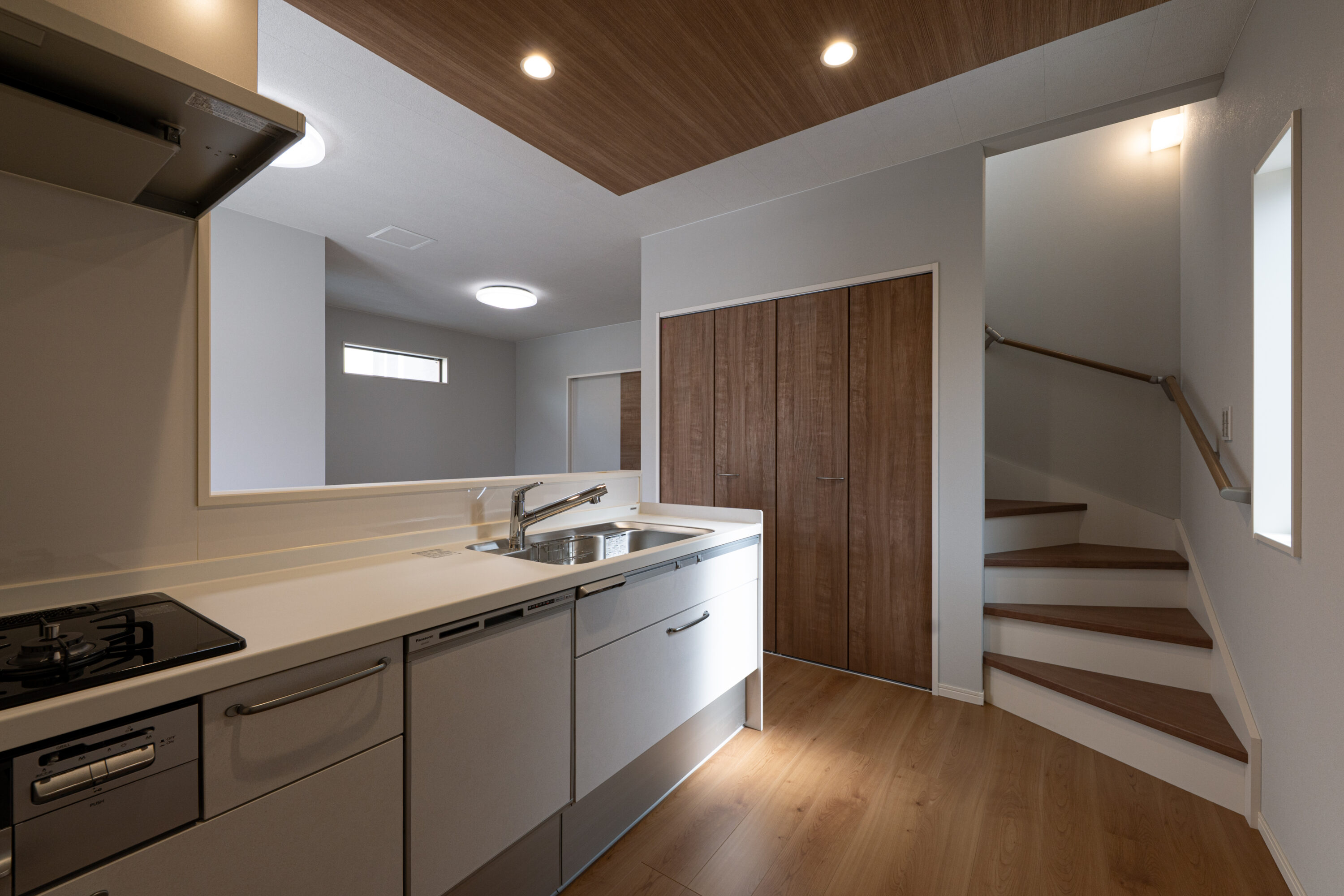 ご家族とのコミュニケーションを取りやすい対面式キッチンを採用。キッチン前面には腰壁を設けているため、調理中の手元を隠すことができます。