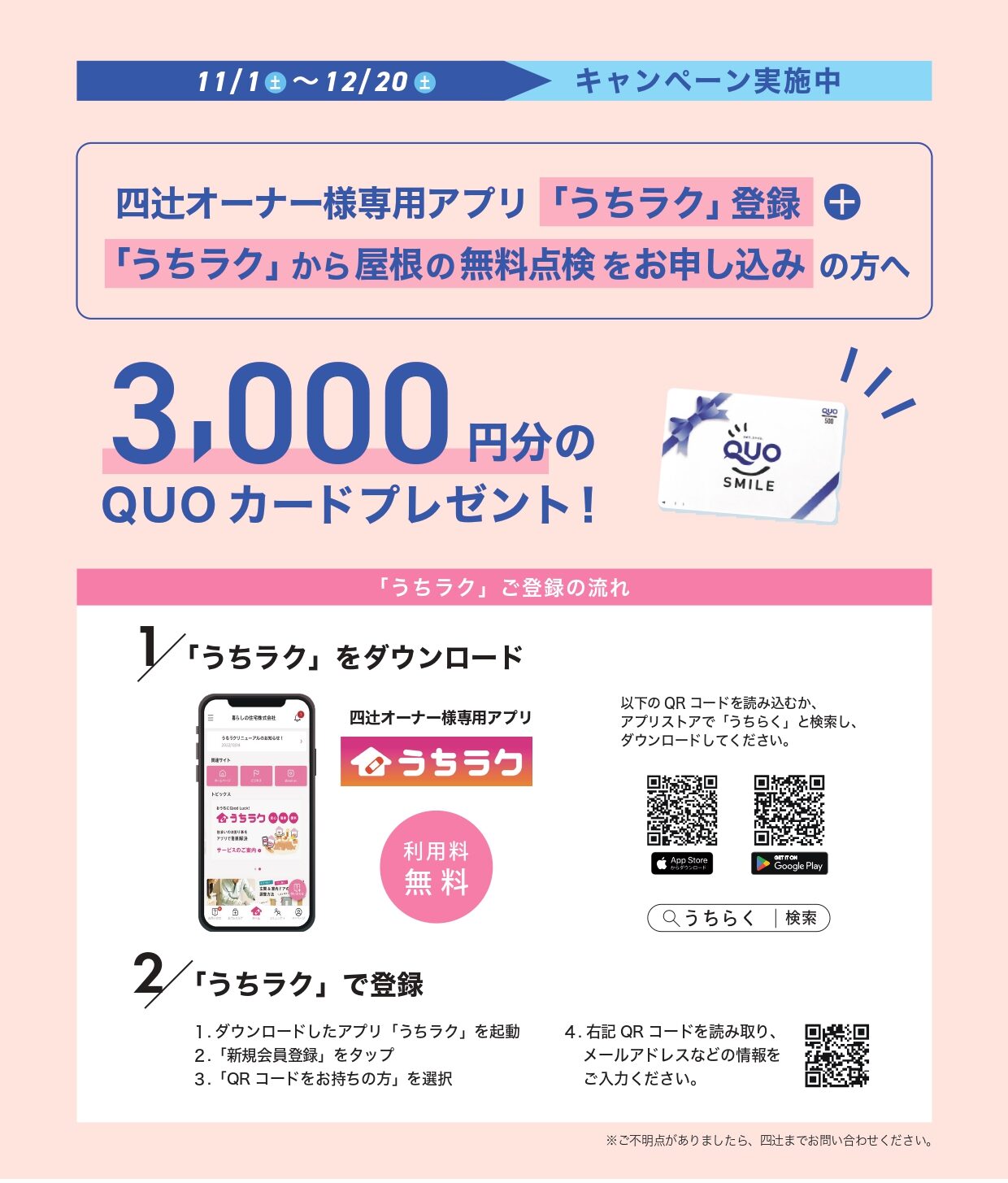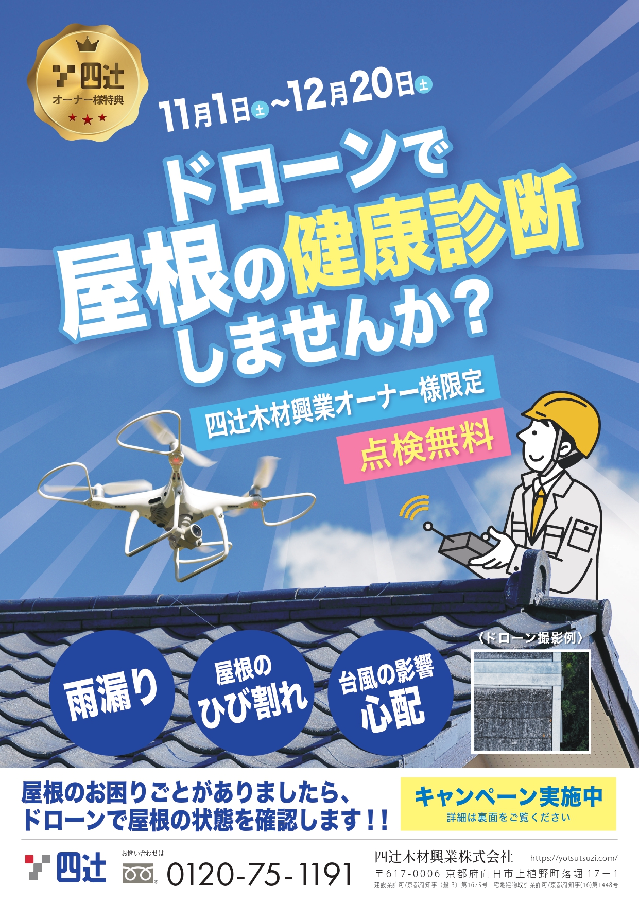 四辻オーナー様限定‼ドローンで屋根の無料点検キャンペーン実施 ドローンによる屋根の無料点検を実施致します! 足場を組まず安全に、屋根の状態を高画質映像で確認できます。 経年劣化や破損の早期発見にもつながりますので、この機会にぜひご相談ください。
