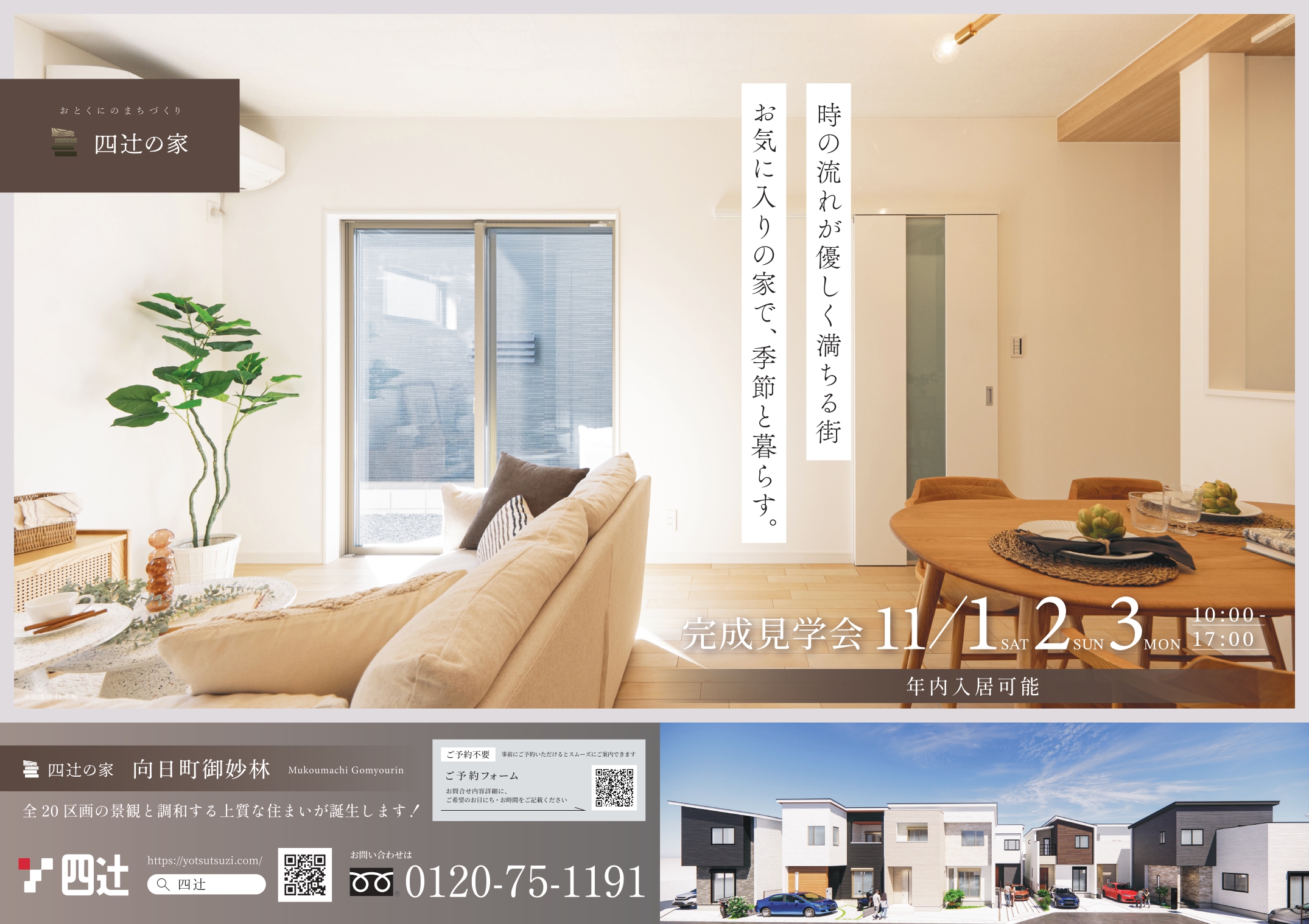 「四辻の家」御妙林 完成見学会開催! 向日町御妙林に「四辻󠄀の家」全20区画の街並みが誕生しました! 住宅見学会を11月1日(土)2日(日)3日(月)に開催いたします! ご予約なしでも見学いただけますので是非この機会にご来場ください。