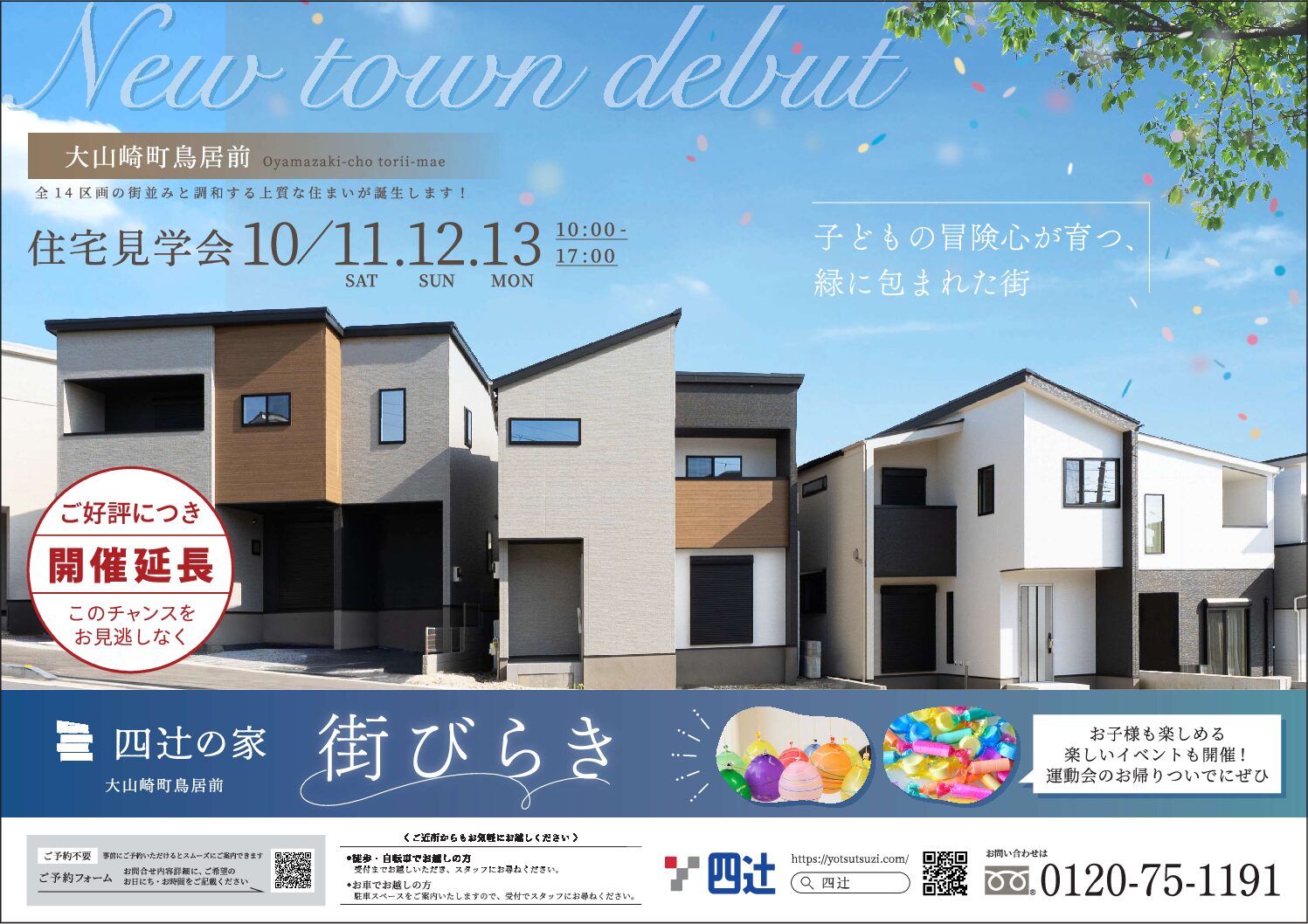 「四辻の家」住宅見学会開催! 大山崎町鳥居前に「四辻󠄀の家」全14区画の街並みが誕生しました! 住宅見学会を10月11日(土)12日(日)13日(月)に開催いたします。 お子様が楽しめるイベントも! ご予約なしでも見学いただけますので是非この機会にご来場ください。