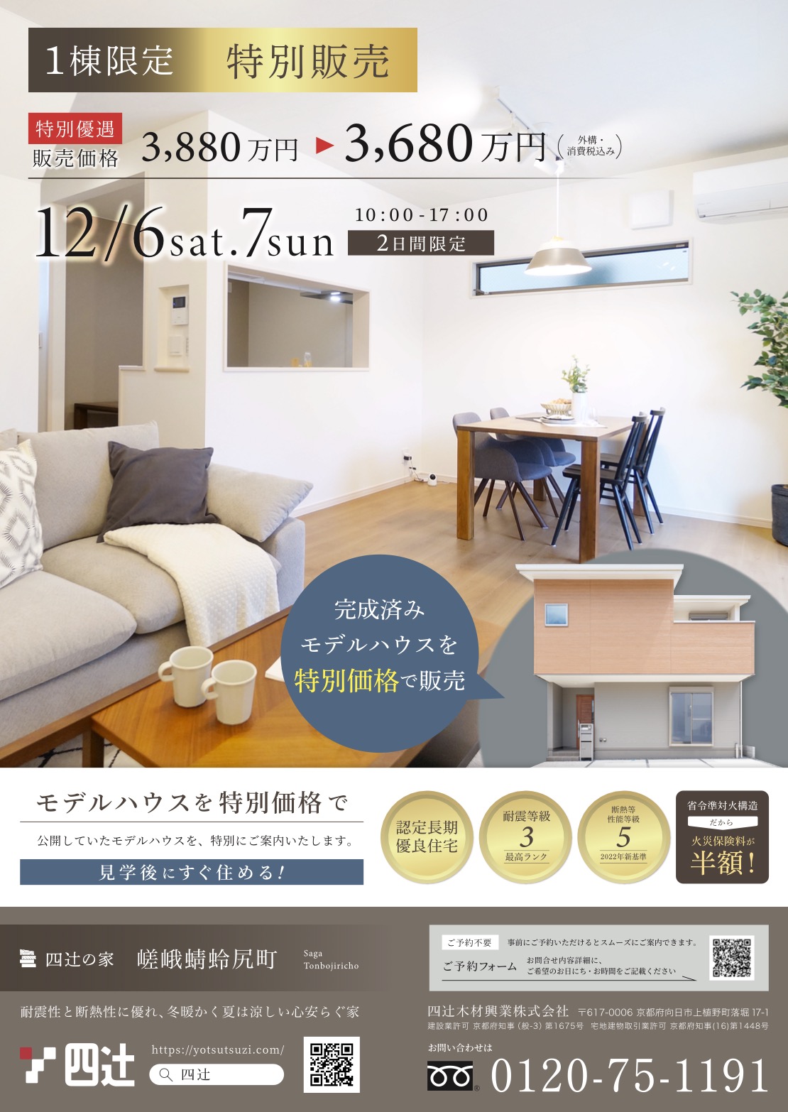「四辻の家」蜻蛉尻モデルハウスが特別価格で!オープンハウス開催! 住宅見学会を12月6日(土)7日(日)に開催いたします! この機会だけの特別価格で、見学したお家にすぐ住めます! ご予約なしでも見学いただけますので是非この機会にご来場ください。