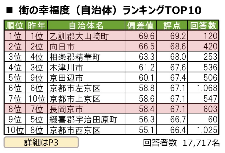 【街の幸福度ランキング2025】大山崎町が府内で5年連続1位!「住み続けたい街」では長岡京市が4年連続1位!