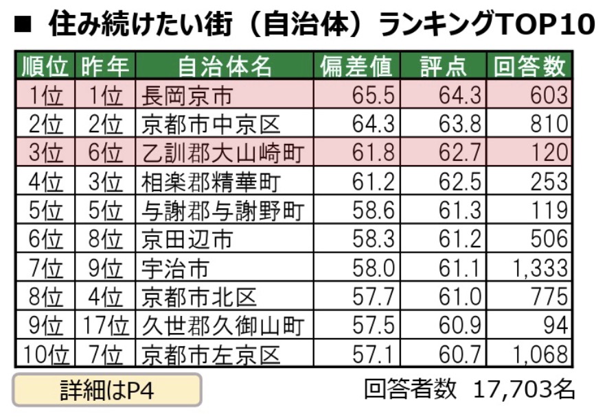 「住み続けたい街ランキング」でも長岡京市が1位となり、おとくに地域の2市1町が上位を占めました。