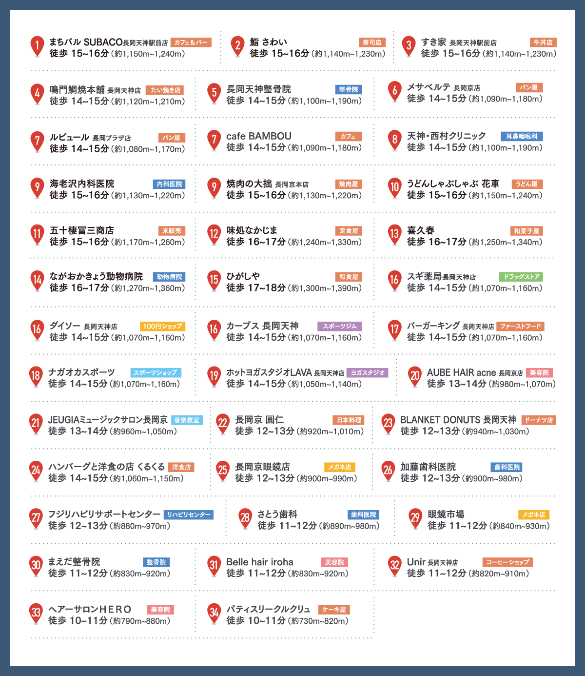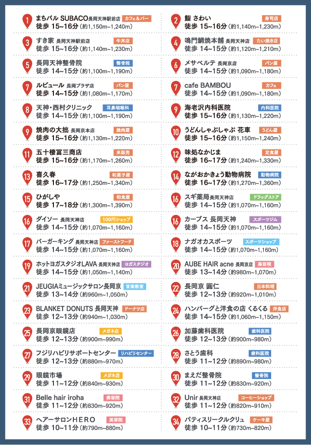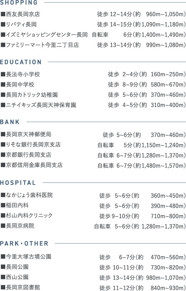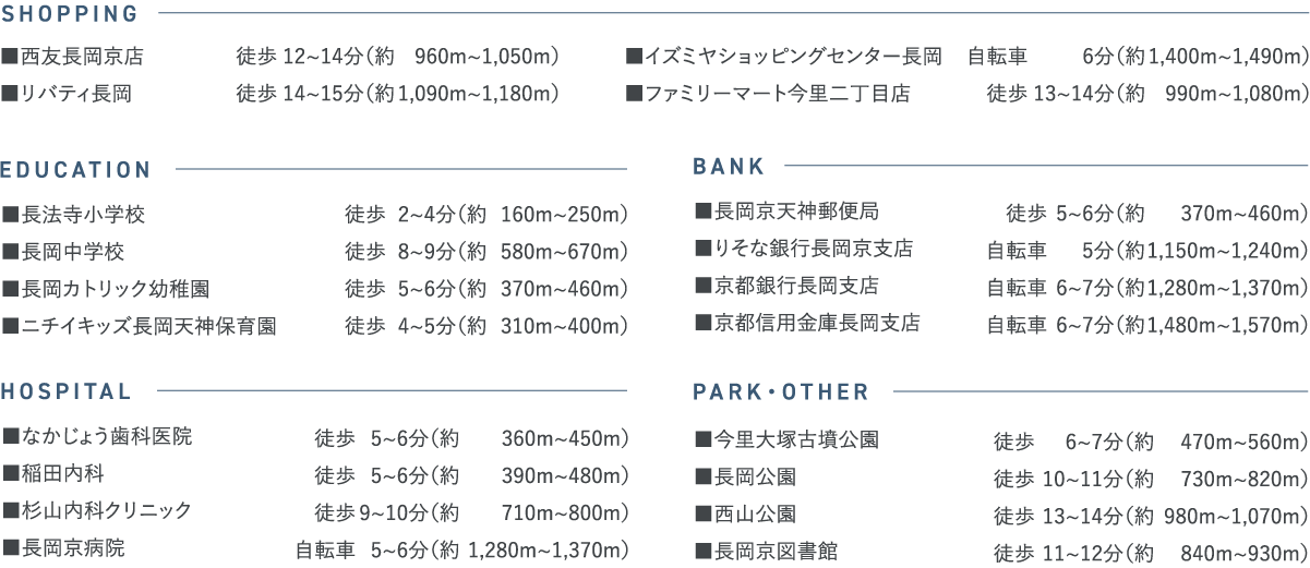 ※徒歩分数は80mを1分として算出、車の所要時間は時速40kmで走行した場合として算出(端数切り上げ)、自転車分数は260m/分として算出(端数切り上げ)した概算時間です。