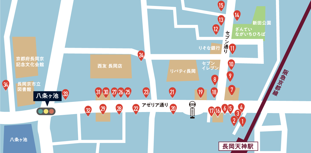 長岡天神駅前に広がるアゼリア通りとセブン通りには、