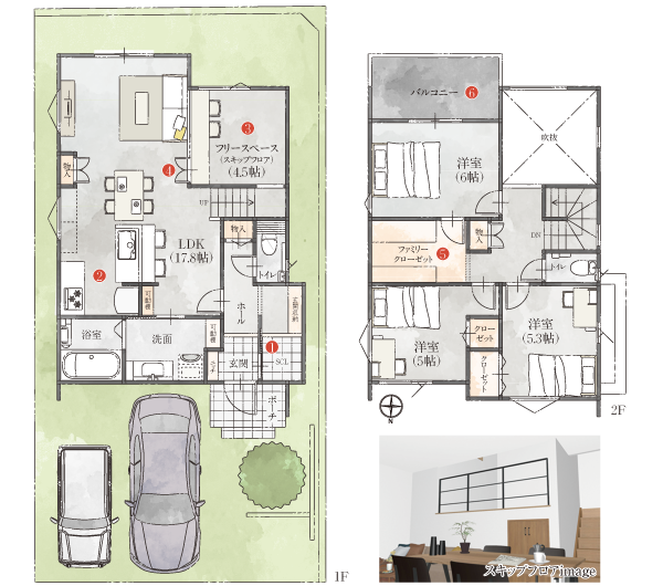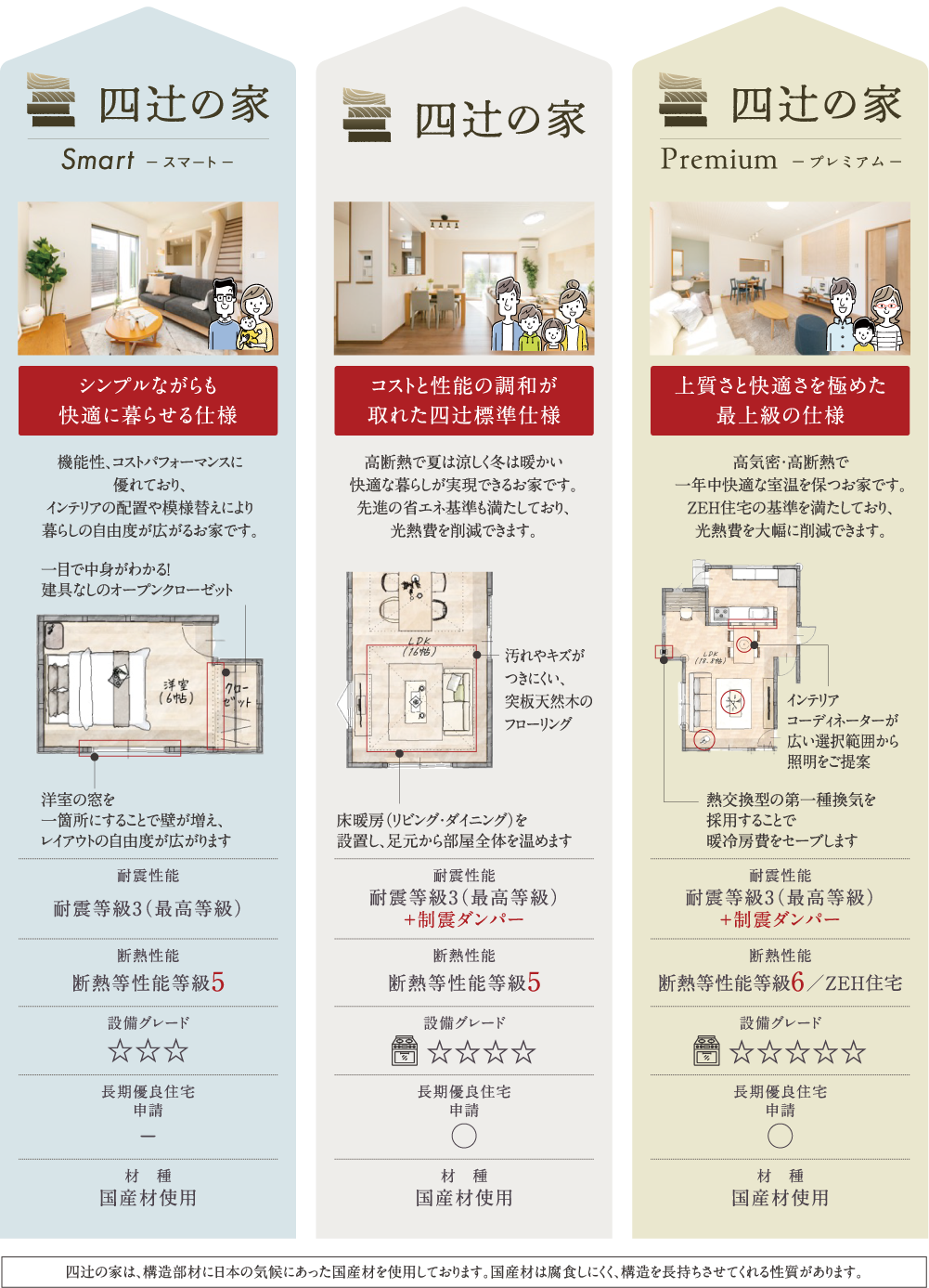 ご家族それぞれの暮らし方で選べる、多彩かつ個性的なプランをご提案。 ※記載の図は、多少変更の生じる場合があります。※水回り設備、家具等はイメージです。図面と異なる場合があります。 お客様のライフスタイルに合わせた3つの仕様 横へスクロールしてご覧いただけます。→