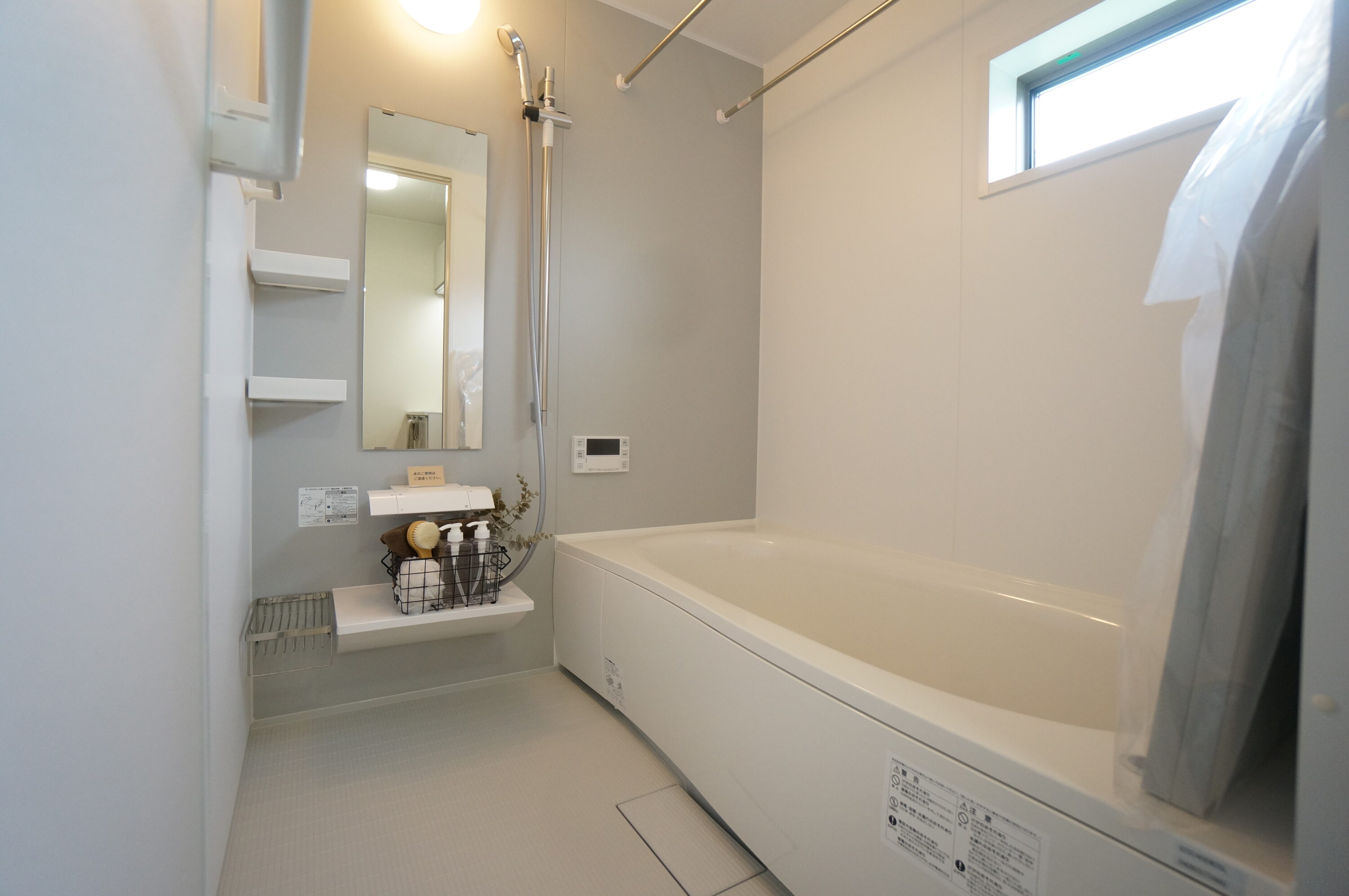 白を基調とした清潔感のある浴室は石目調がアクセントとなっており高級感のある空間となっております